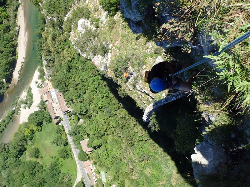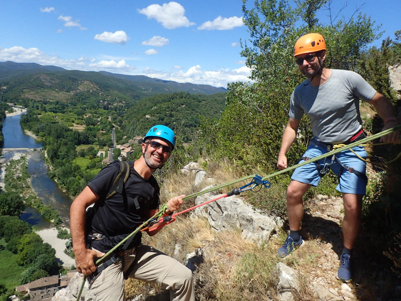 Vibrez au-dessus du vide à la Porte des Cévennes. Le rocher de st Julien situé à 20 min à pied du village d’Anduze, vous offrira une vue panoramique entre Cévennes et Garrigues, avec un point de vue saisissant sur la vallée du Gardon d’Anduze. Le paysage est typique des garrigues des Cévennes méridionales. Rocher calcaire, une riche flore rupestre, arbousiers, chênes verts et genévriers. Un site patrimonial remarquable !! De la préhistoire à l’antiquité, de nombreuses traces attestent la présence Humaine en ce lieu stratégique, c’est pour cela que nous vous proposons un itinéraire sauvage et aérien. Nous accéderons à son sommet par un très ancien chemin escarpé creusé dans la falaise où l’on emprunte d’antiques marches taillées dans la roche. La descente du sommet se fera en 4 rappels vertigineux, avec à la clé un passage sous une arche artificielle du moyen âge et le rappel final, en fil d’araignée jusqu’au pied de la face nord du rocher de st Julien (de 10 à 50m).